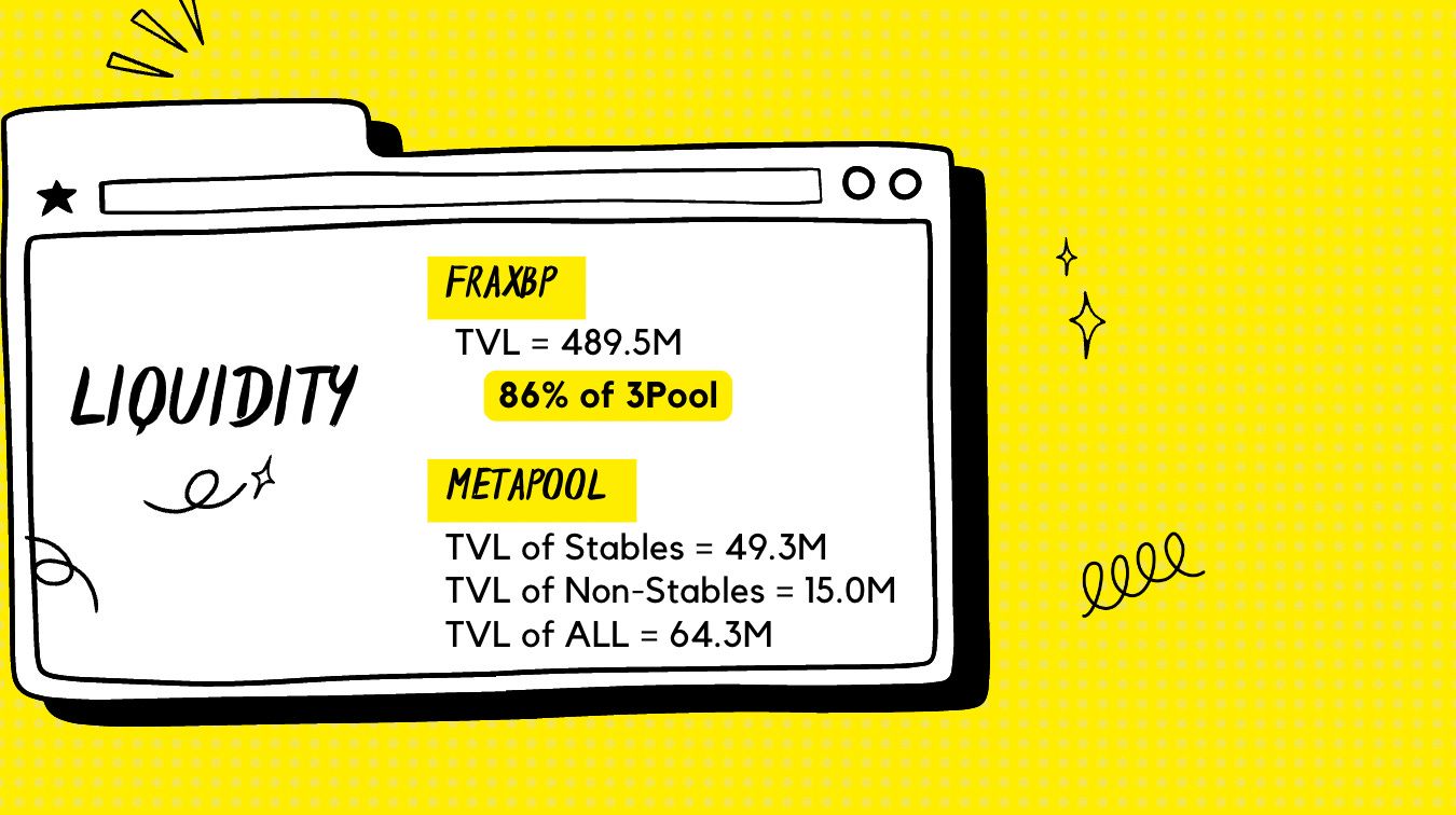 Summary time.  Liquidity Check.  FraxBP is 489.5M which is 86% of 3Pool.  The MetaPool is at $49.3M for stable pairs and $15.0M for non-stable pairs.  And TVL of All pairs (stables + non-stables) are at $64.3M.