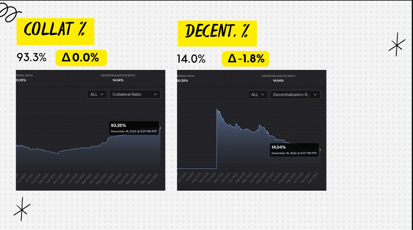 This is the % that conveys how much FXS (algorithmic) is used as collateral.  We are unchanged over the week at 93.3%.  We’ve been at these levels for the last 5 Frax Checks.  Following we have the Decentralize %.  We bounced off the lows and have been hovering around the 14 to 15% mark.  This week we’re back down to 14% so that’s down move of 1.8%.   But still V v v v much bear market vibes across the board when it comes to these two metrics.  We want to see the Collat % going back to the low 80s and the Decent % going back to 30s.