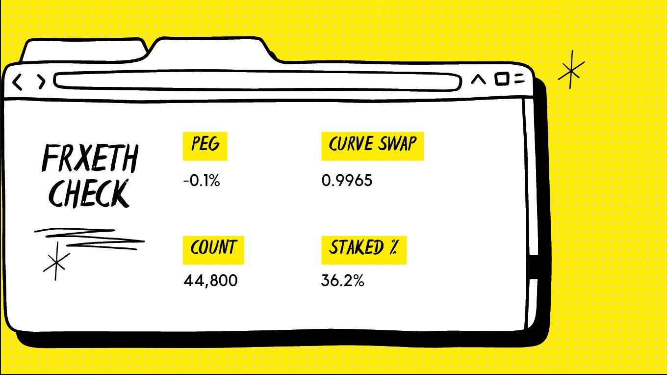 Next, we have our new segment of the check where we look at FrxETH.  As always, we check the peg.  Peg check here is strong you see the price delta is only 0.0014 between frxETH and ETH.  Pretty much unchanged from last week.  But we obvs have to go into the market and check this ourselves and you see here that I tried to do a 3500 ETH swap which is roughly the amount of the largest frxETH holder and I get an exchange rate of 0.9965.  That’s not too bad.  Also, last week we had 61% of the frxETH staked in the Curve pool, and now we’re up a little to 63.5% of the supply inside curve.  The APY as per Convex is at 9% projected versus 10.8% for sfrxETH.  Littttt.  Let’s see what the count looks like this week.