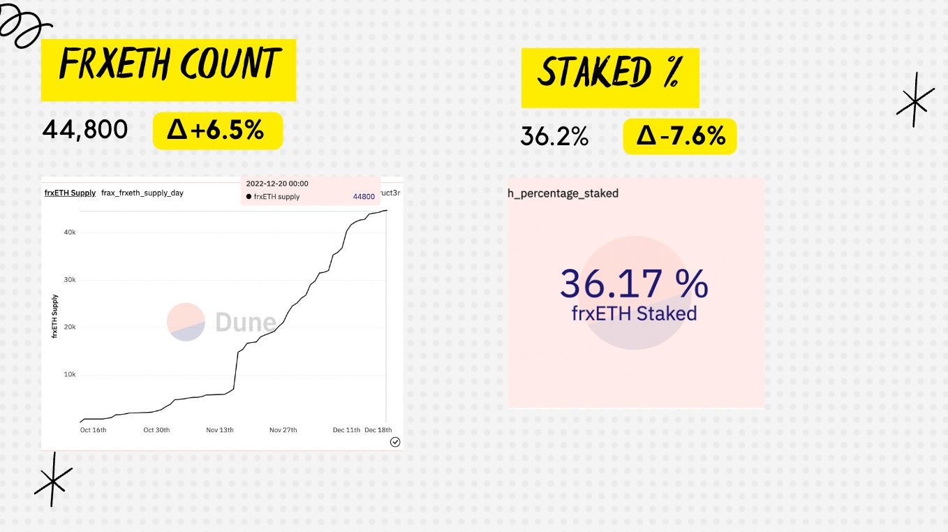 The count is at 44,800.  And look at that chart, I know you can’t read it but just appreciate the verticalness off that graph.  +6.5%.  Hot.  It may look like we’re tapering a bit but let’s see if we resume the uponly action next week.  On the staked side we see that 36% of all the frxETH is being staked to earn the ETH native staking rewards, which is projected at the 10.8% -- very nice.  Let’s do a quick summary check.