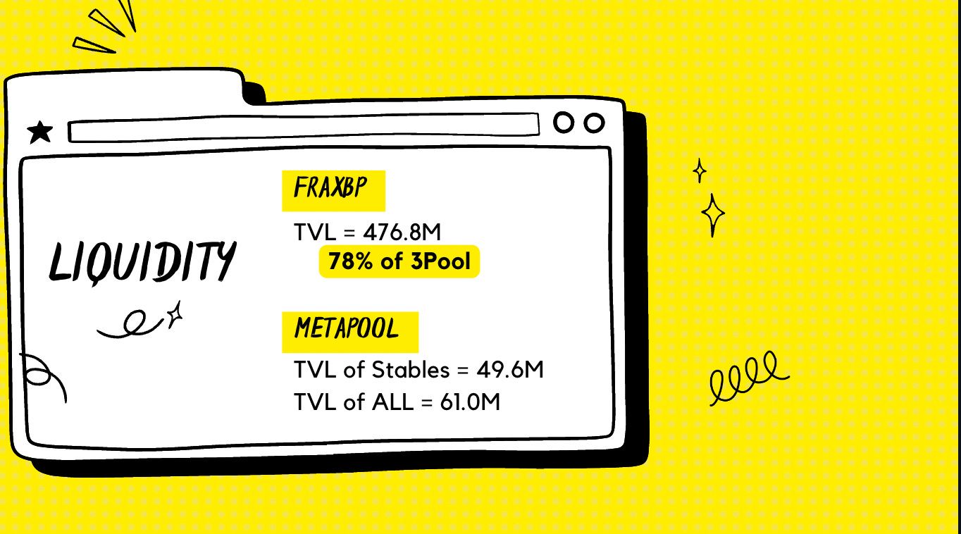 Here's my favorite section of the Frax Check.  The Liquidity Check.  Do you guys remember the theme of this week, it was “Lil bit of this and lil bit of that”. Well, we’re unchanged.  We’re at 78% of the 3POOL.  The FraxBasedPool is $476M versus 3pool's $613M.  The basedpool pretty much unchanged since last week.  But Note that we’re NECK-to-NECK with Frax3CRV pool again.  Let’s first flip this then we set our eyes on the 3pool.  Moving on, let’s chat about our metapools.