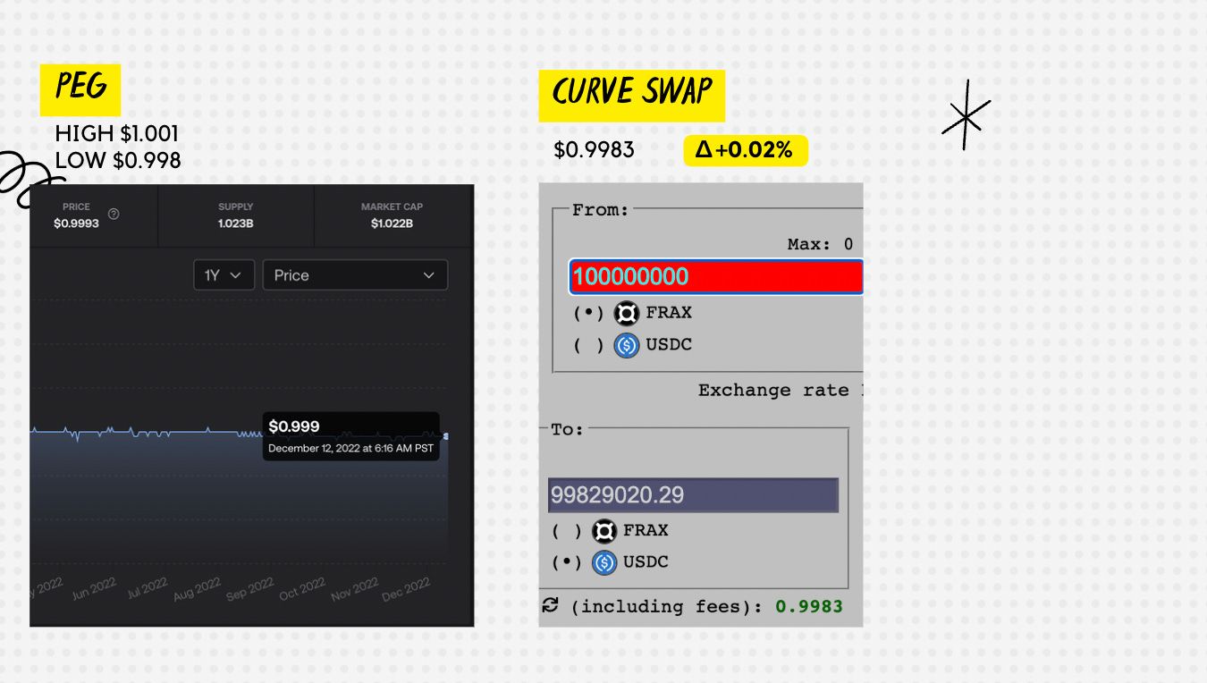 Let's begin our regular programming with the Peg.  We saw it get as low as $0.998 with a high of $1.001 for the week.  Peg Check = Strong.   We then looked at Curve via swapping 100M FRAX for USDC.  We received a 0.9983 exchange rate, which is an increase of 2 bps compared to last week’s.  So both metrics pretty much unchanged.  Moving on we have our Collateralization %.