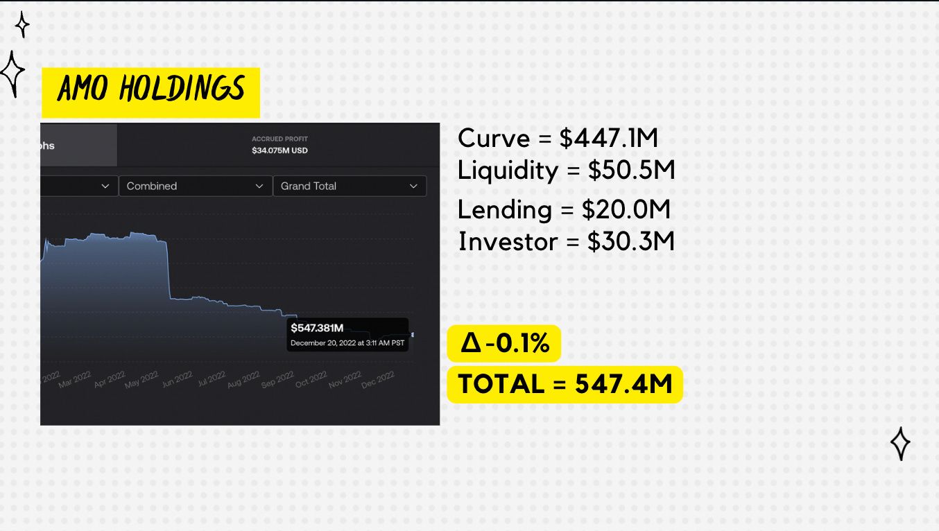 Let's jump into the AMO Holdings.  We have a grand total of $547.4M across all the AMOs.  This was unchanged compared to last week.  The Curve AMO increased by $3M.  And the Liquidity and Investor AMO decreased by like $5M.  So just some musical chairs going on with the assets here.  No news this week on the AMOs.  Again we are ranging here too.  No much movement in the past few Frax Checks.
