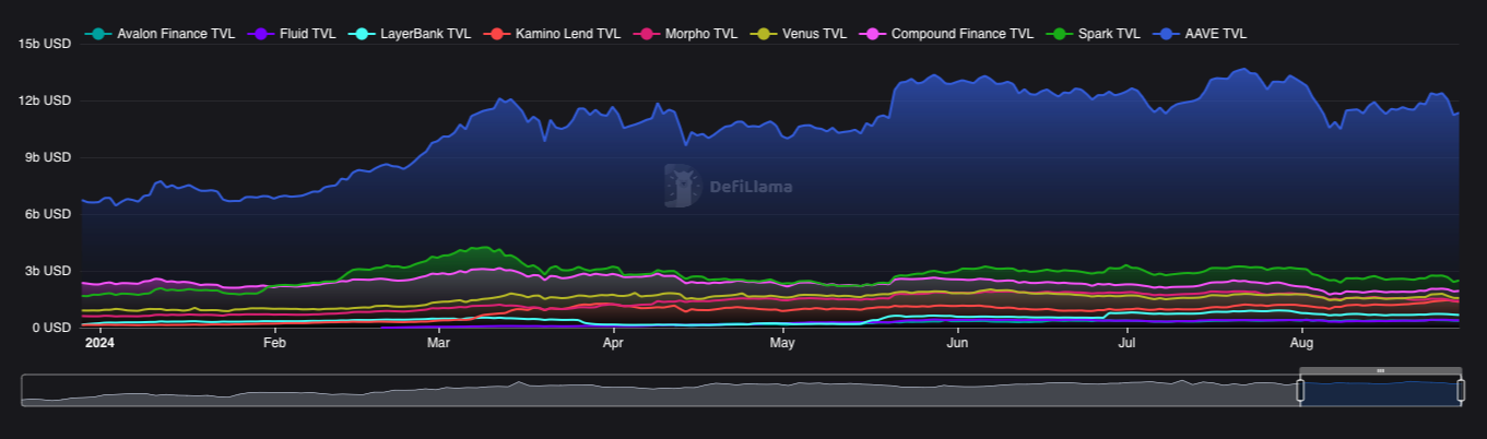 Comparing Aave to its top 10 competitors, excluding Tron, they have a majority share of all lending TVL at 53% and growing.