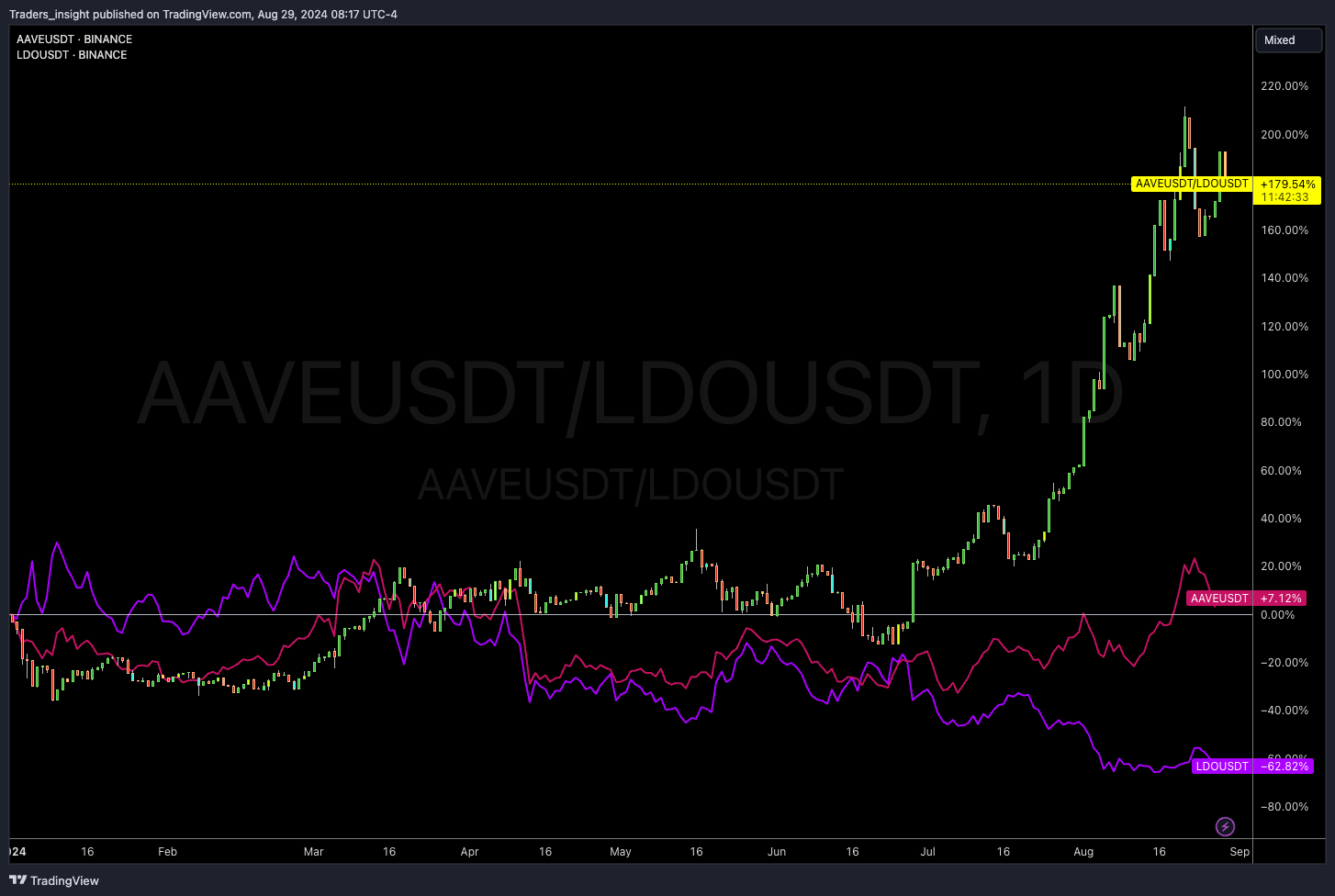 Since July, the two behemoths of DeFi, Lido and Aave's tokens have diverged significantly. Lido is getting crushed, down 62% on the year, while Aave is up 7%. If you took this long/short trade, you would be up nearly 200%.