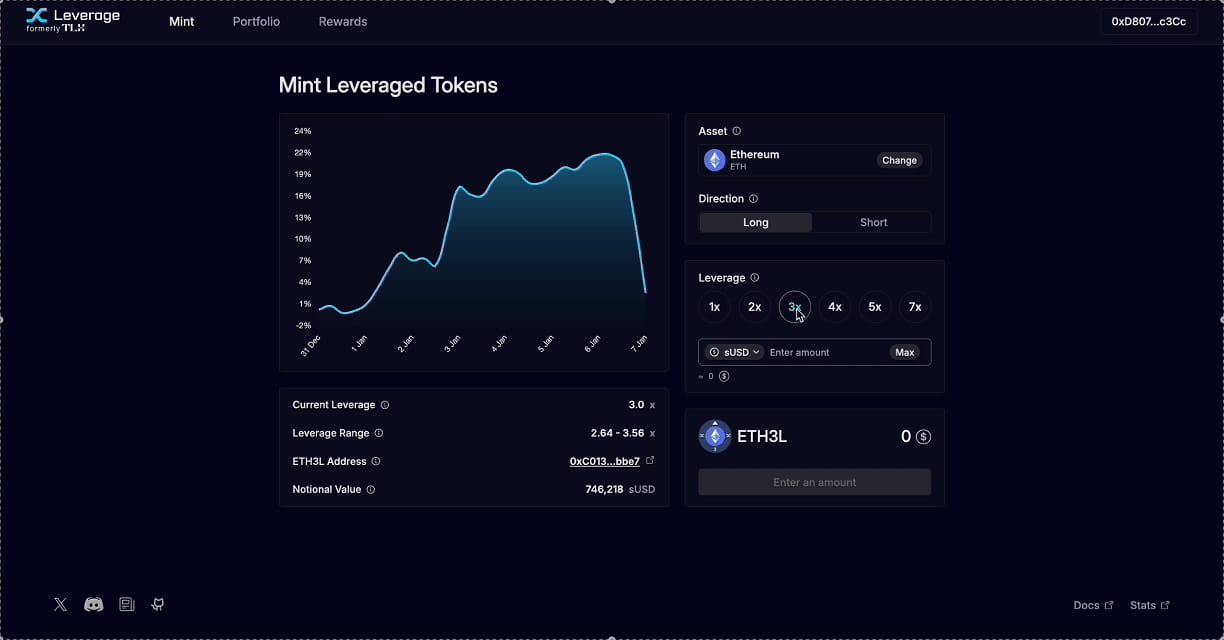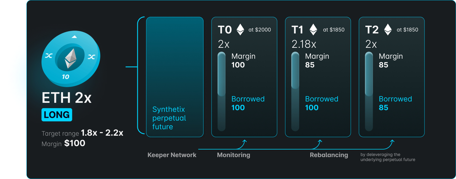 Unlike traditional perpetual futures, where leverage can drift due to changes in the margin-to-notional ratio, Synthetix’s leveraged tokens dynamically rebalance to maintain their targeted leverage range.