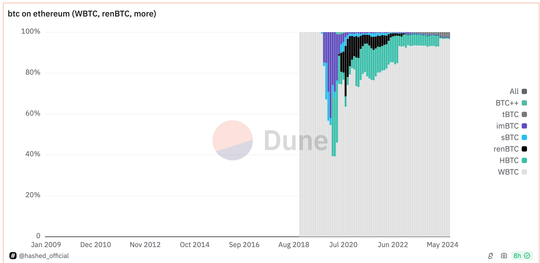 WBTC currently enjoys a 95%+ market share of wrapped Bitcoin across all EVM networks. Their dominance is unmatched, partly due to the poor business economics.