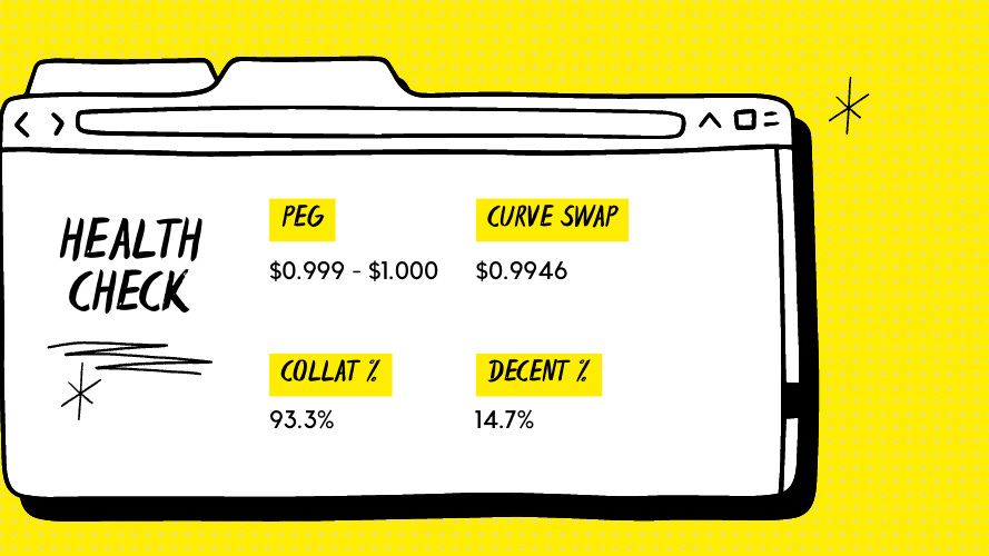 Okay.  Quick summary Health Check.  Peg Good.  Curve Swap much better this week.  Collat % could be better.  Decent % bounce from ATL.