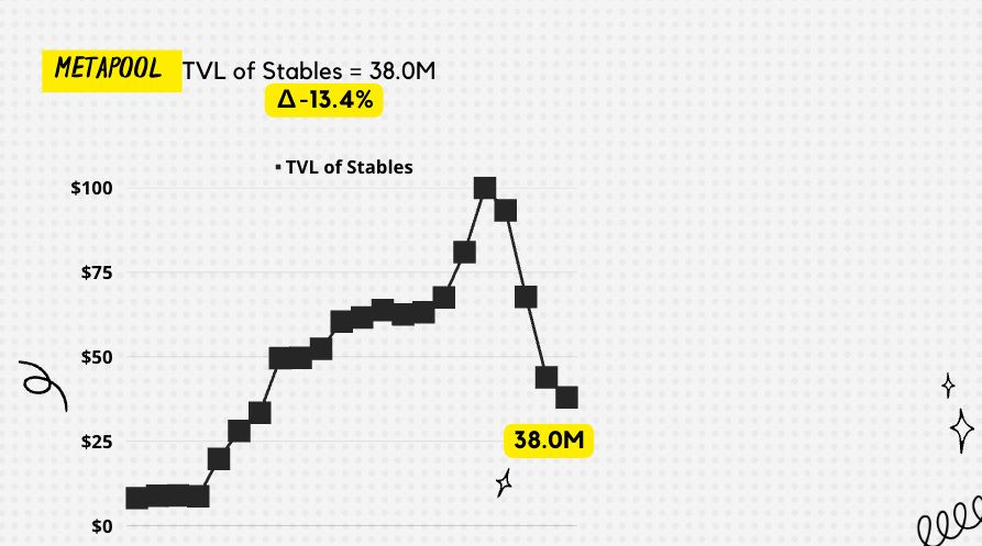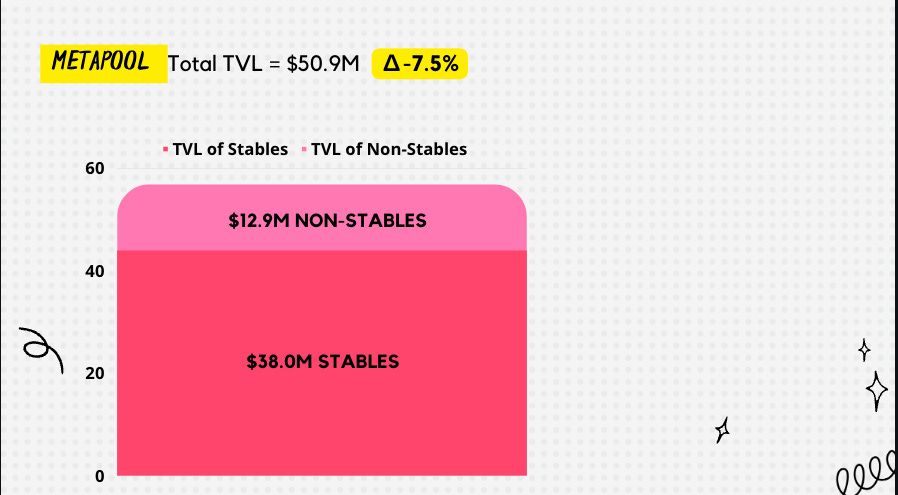Reminder the metapool are pools that are PAIRED with the BasedPool, examples like LUSD/FraxBP.  We pretty much retraced all of our momentum for the last 13 weeks.  We’re currently at $38M, which is a 13% decrease WoW.  Any projects out there looking to work with the Metapool, please join the Flywheel pod TG chat and DM any of the hosts for assistance.