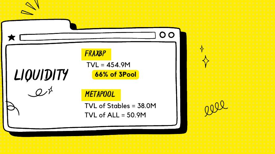 Summary time.  Liquidity Check.  FraxBP is 454.9M which is 66% of 3Pool.  The MetaPool is at $38M for stable pairs.  And TVL of All pairs (stables + non-stables) are at $50.9M.