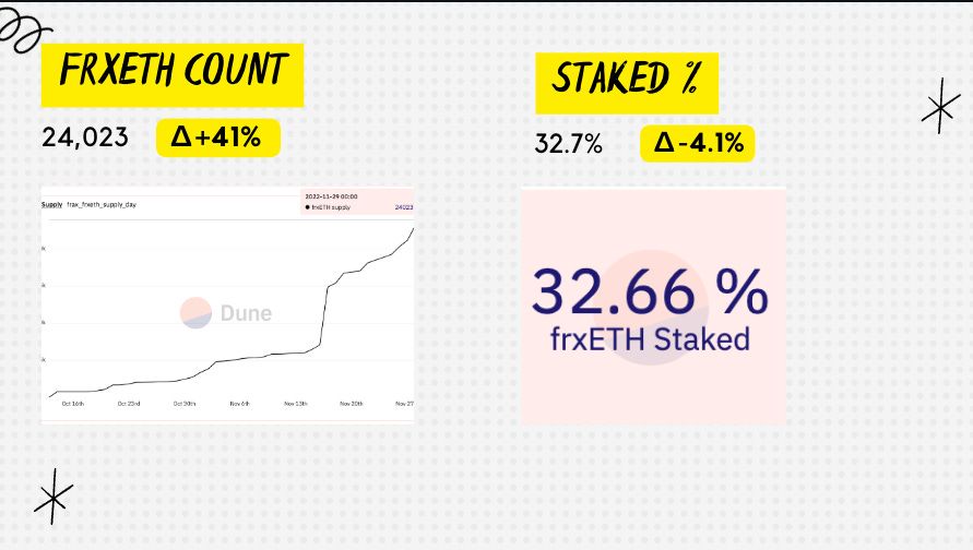 The count is at 24,023.  And look at that chart, I know you can’t read it but just appreciate the verticalness off that graph.  +41%.  Hot.  On the staked side we see that 33% of all the frxETH is being staked to earn the ETH native staking rewards, which is 5-7% but since only a third of frxETH is staked we can multiply that 5-7% by 3x.  Let’s do a quick summary check.