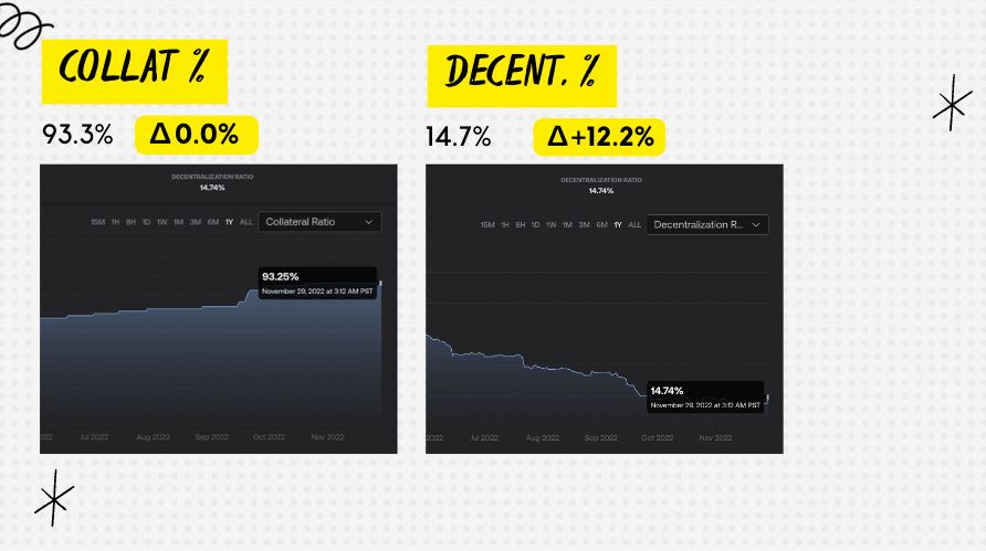 This is the % that conveys how much FXS (algorithmic) is used as collateral.  We are unchanged over the week at 93.3%.  Following we have the Decent %.  We bounced off of the lows and are now at the 14.7%, which is a 12.2% increase from last week’s Frax Check.  V v v v much bear market vibes across the board when it comes to these two metrics.  We want to see the Collat % going back to the low 80s and the Decent % going back to 30s.