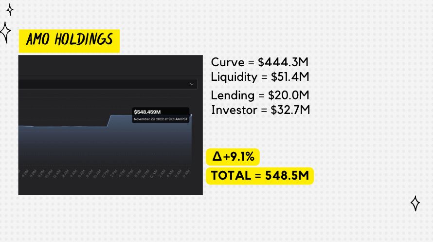 Let's jump into the AMO Holdings.  We have a grand total of $548.5M across all the AMOs.  This was an increase of 9% compared to last week.  A healthy lil bump here.  The Curve AMO increased by nearly $40M.  These are wicked AMO moves.