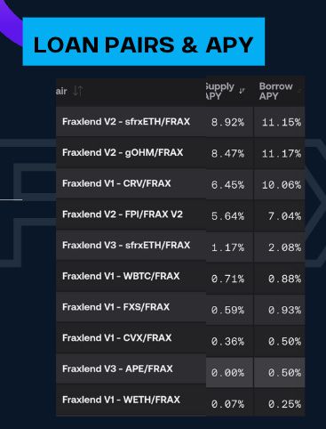 The highest supply APYs are the sfrxETH/FRAX at 8.9%, gOHM/FRAX at 8.5%, and CRV/FRAX with a juicy 6.5% APY.