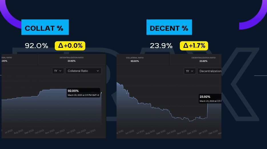 This is the percentage that conveys how much FXS and other digital assets (algorithmic) are used as collateral.  It is unchanged at 92%.  The Decentralization ratio increased 1.7% and is now at 23.5%.