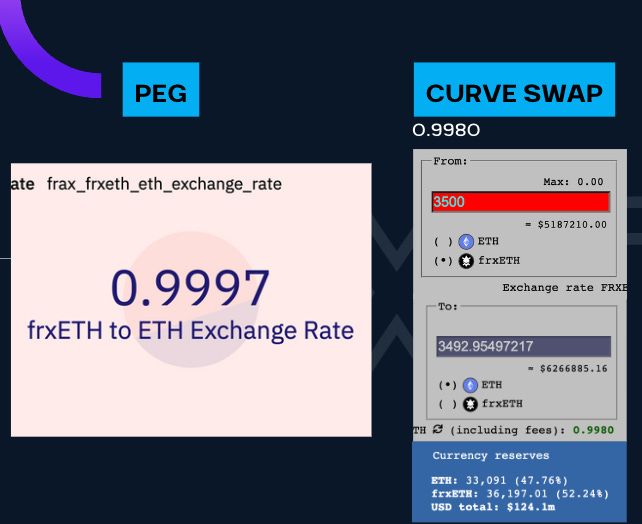 The peg check is back to one of its best rates ever at 0.9997.  Swapping 3500, which is roughly the amount of the largest frxETH holder, gives a rate of 0.9980.  Not too bad considering we got as low as 0.995 last week.  Fortunately, the TVL is quite sticky at $124m, an increase of $10M from last week.