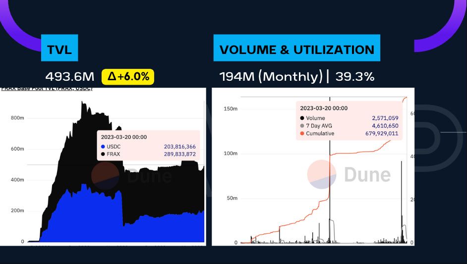 The last leg of the Stablecoin Maximalism: the DEX aka FraxSwap.  Per DeFi Llama, the TVL is $69M with 128M monthly volume for March so far. We just took the Monthly volume divided by the TVL to get a utilization rate of 185%.