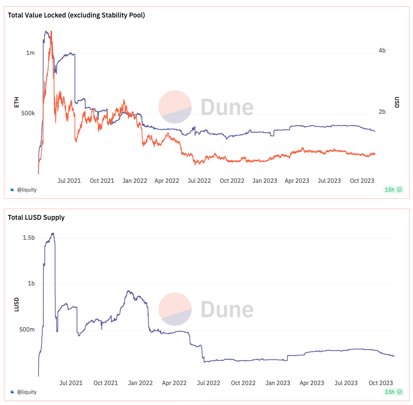 Liquity's main growth problem, however, is that it was deployed in a time before LSD's became the primary asset ETH DeFi users desire to hold and collatearlize. At its peak, over 1m ETH was used to collatearlize LUSD, which peaked in supply at 1.5bn USD in its earliest months. Since that point, its ETH TVL has dropped to 300k ETH, roughly similar to the entire supply of frxETH.