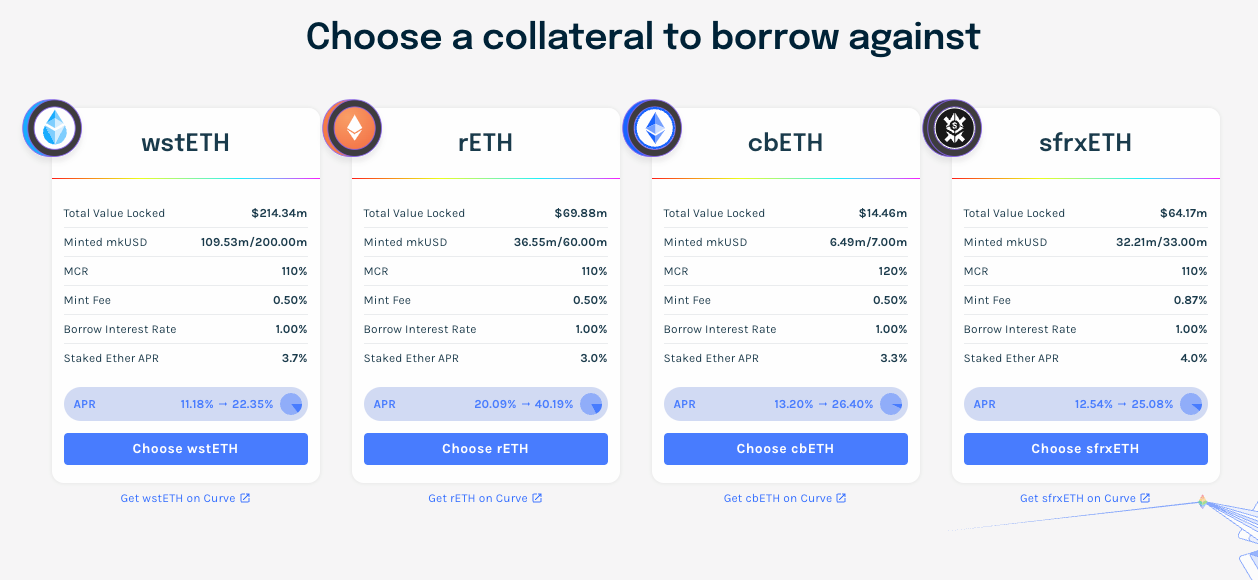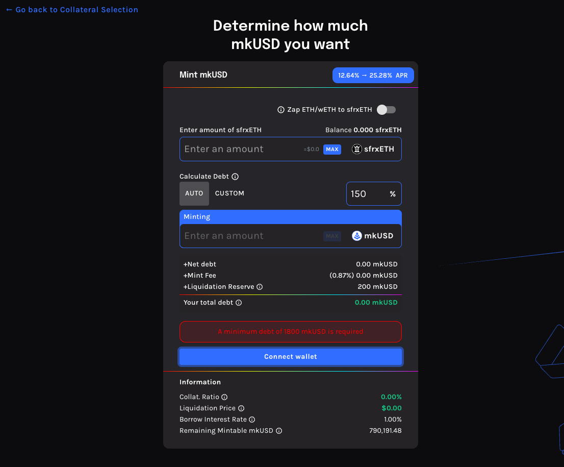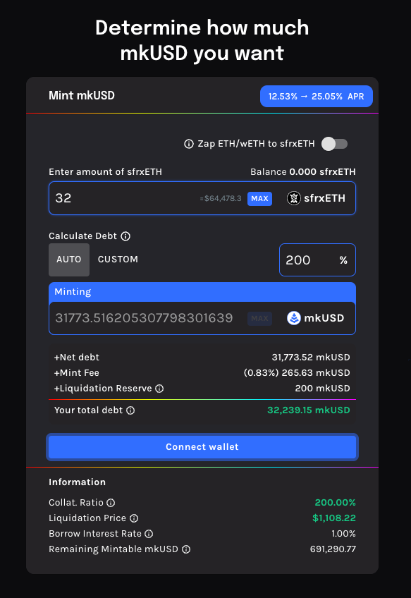 Mint MKUSD against sfrxETH by visiting Vaults and then selecting sfrxETH. On Vaults you will see the total amount of minted MKUSD, sfrxETH TVL, mint fees, and the borrow interest rate. Additionally there is an incentivized APR for borrowing MKUSD.