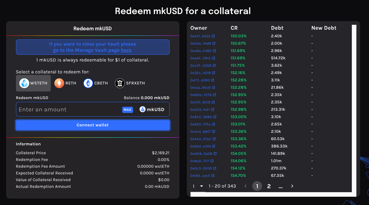 The heavy selling pressure to acquire other assets pushes the price below $1 and then arbitrageurs scoop up the risk free MKUSD and redeem it against the vaults with the lowest CR. In the picture above, the lowest CR is 150%. When a Trove is redeemed, your sfrxETH Trove is paid down and your sfrxETH is released to the arbitrageur.