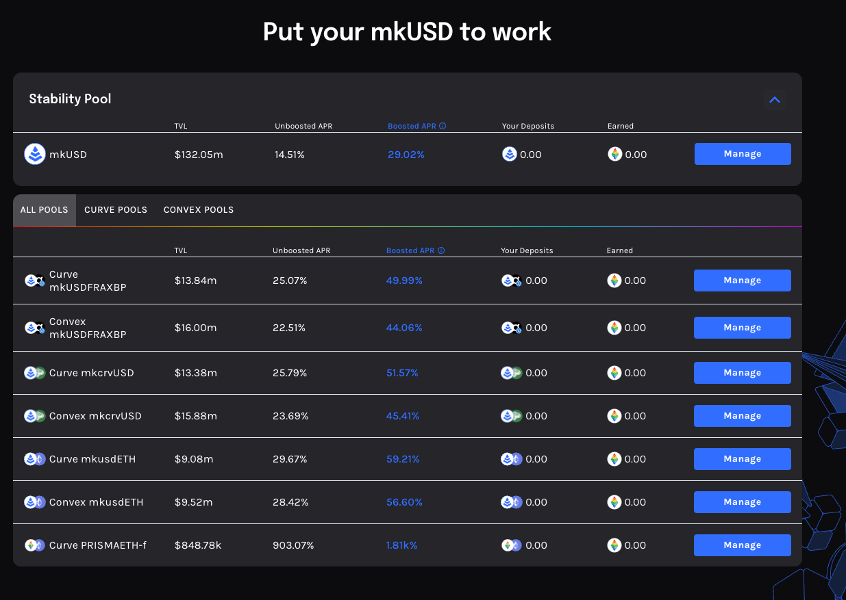 Once you mint MKUSD, there are a variety of secondary farming options. You can deposit your funds to the mkUSD redemption pool, which is used to facilitate liquidations and earn 14.51% unboosted or 29.02% boosted yields.