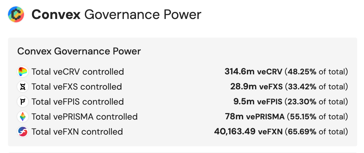 But Convex had a little trick up its sleeve, how do they lock the majority of Prisma tokens is one gulp! They used greed and the bear market to incentivize locks. To keep this simple, in order to claim your airdrop you had 2 choices, you could claim it as locked vePrisma, and wait 52 weeks, or you could opt for a liquid version of cvxPrisma and get all of your drop at once and stake it on Convex for 200%+ APY. Naturally most people chose to claim the liquid version. But there’s a catch, if you claim your drop as cvxPrisma, you are in essence auto locking your vePrisma voting power with Convex. Something I call “droplock”. The act of using an airdrop to incentivize locks into Convex.  At the time of writing, Convex has over 55% of all circulating Prisma voting power. Vote power that will be used to do a variety of cool things!