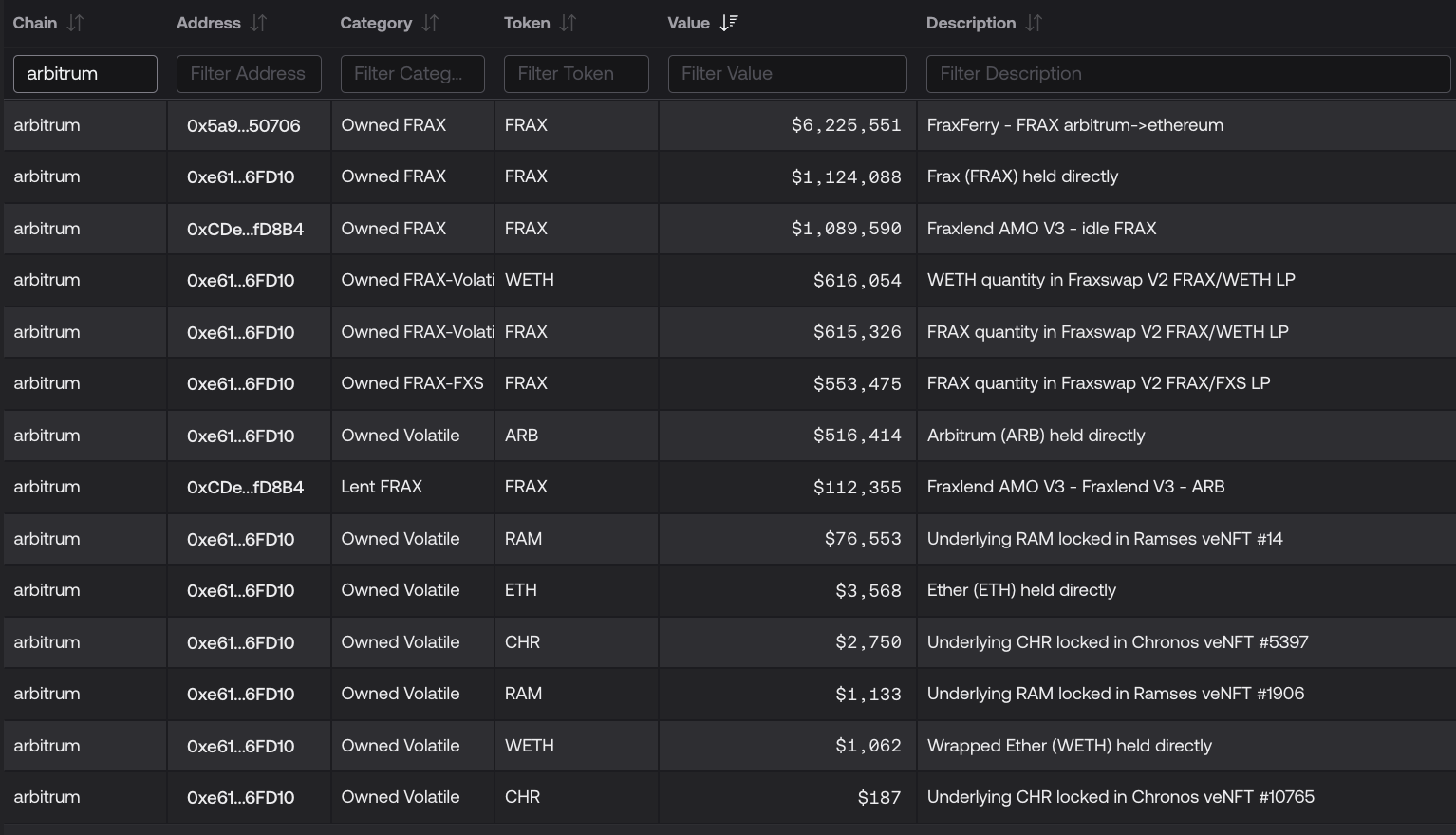 According to Frax Facts, around 10m worth of assets are currently held on Arbitrum. This includes $6m worth of Frax, 1m for the Fraxlend AMO to support ARB, and other assets placed in various protocol's LPs.