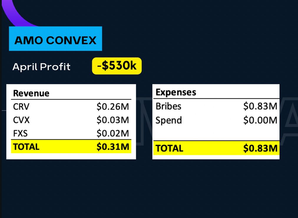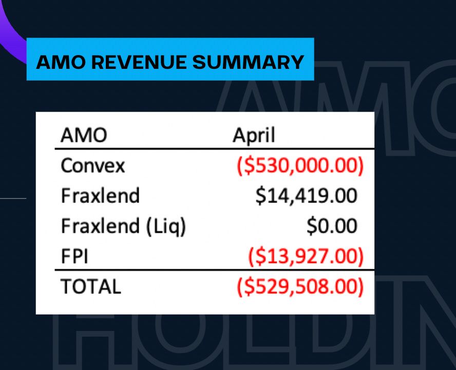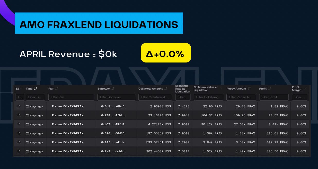 Here we aggregated all the revenue across the AMOs and FPI.  We have $530k in losses from Convex — granted we just paid the bribes and yet to reap the rewards.  We received $14k from the FraxLend AMO from supplying FRAX and we did not receive any fees from liquidation in April so far.  On the FPI front, there’s currently a “loss” of $13.9k but there are over $50k of unclaimed rewards so once those rewards are claimed we can update the figures here.