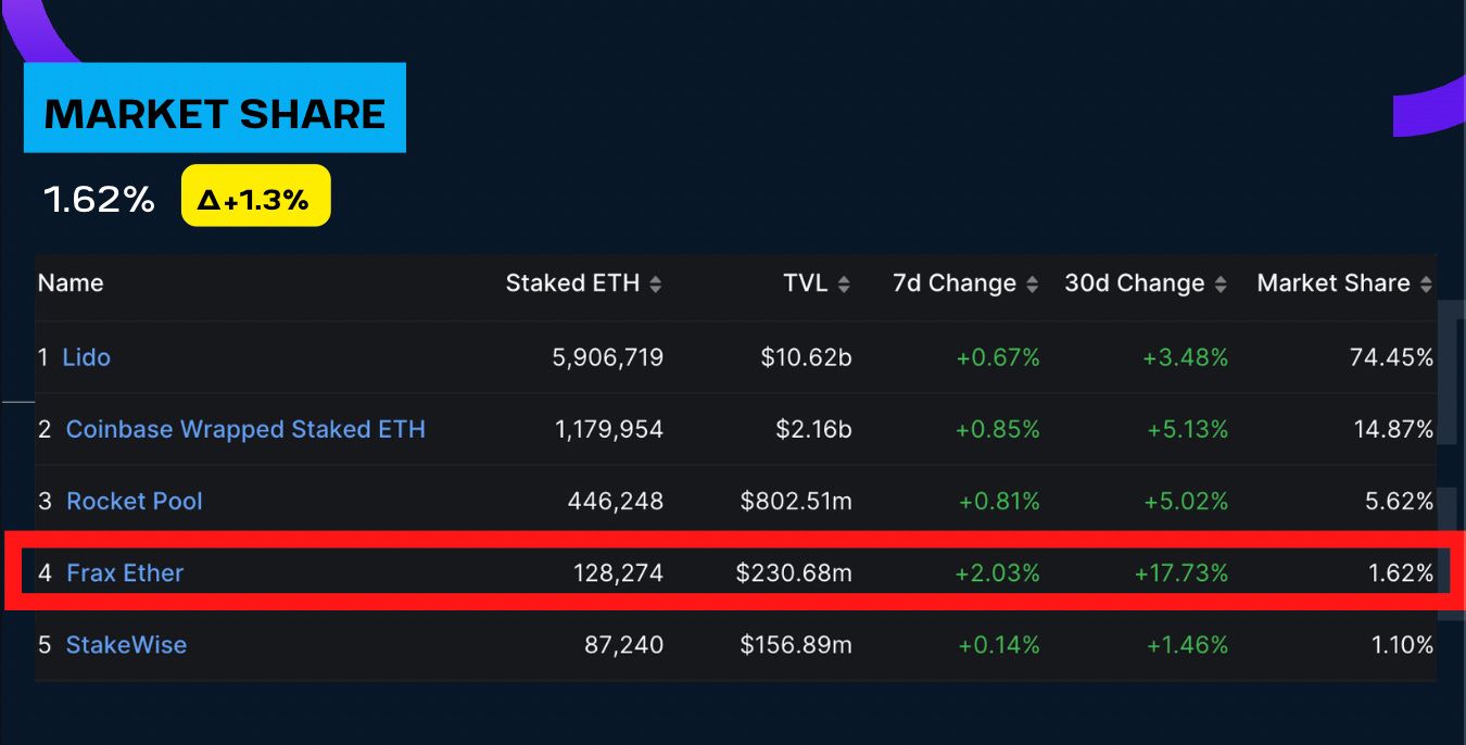 When looking at the competitive landscape, there’s Lido at the front of the pack with nearly 75% of the market.  Frax is currently fourth on the list with a market share of 1.62% but it has the highest 30-day change of 17.7%.  Though in the yield department, frxETH is at the top of the list with 5.64% versus the closest competitor Stakewise at 4.54%.