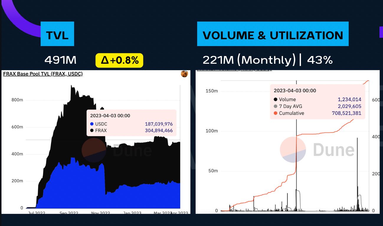 The FraxBP has a TVL of $491M — the ratio is reverting back to 60/40.  This also means that the exchange rate isn’t the best like it was a few weeks ago.  We have a 221M monthly volume which is a 43% utilization rate.
