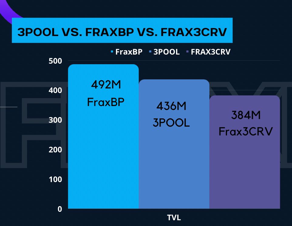Fortunately, we are maintaining our stronghold above the 3pool.  We’re currently 113% of the 3Pool.  We were able to hold onto our grounds for the past four weeks.  Additionally, we have the breakdown of each of the pools here.  The TVLs are $493M for FraxBP, $436M for 3Pool, and $384M for Frax3CRV.