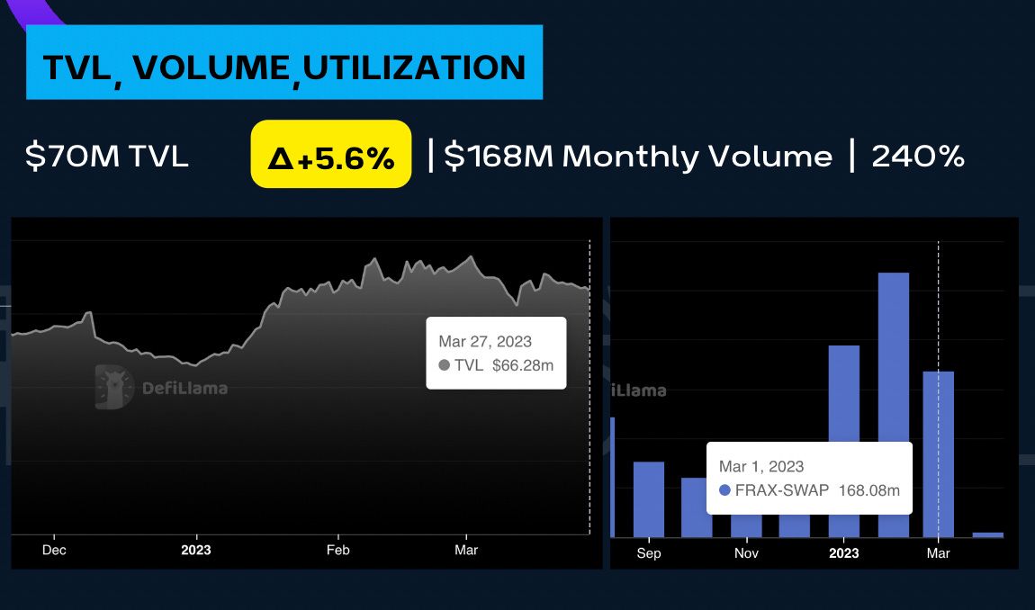 There’s $70M in TVL for Fraxswap but the impressive part is the volume that it facilitates.  There were $168M volume in March and the top volume pool the past 7 days is the FXS/FRAX pool with nearly $20M.
