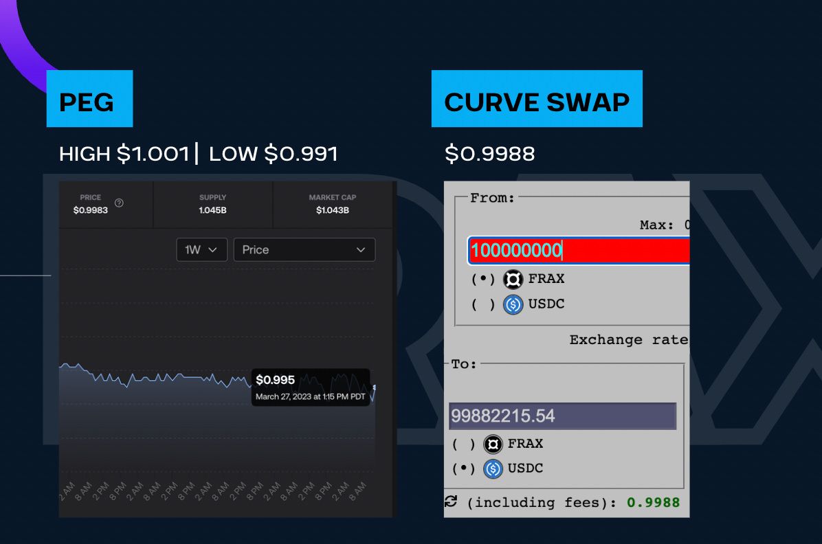 As always, we have our flagship stablecoin: $FRAX.  Though there aren’t much news on this front.  The supply has remained flat at $1.045B and the peg ranged from $0.991 to $1.001.  The lower end of the range is concerning but we believe we’re still recovering from the USDC fiasco.  In the markets, we swapped 100M FRAX for USDC and received an exchange rate of 0.9988 — pretty much unchanged from last week’s.
