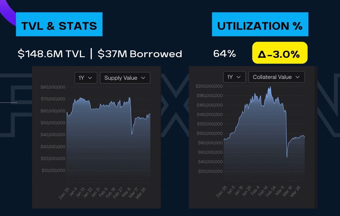 The Fraxlend product has been slowly recovering since the USDC depeg but things are nowhere near the level it was.  The collateral value and the supply value is still grinding to get to where it once was.  The utilization rate is also down to 64%.  We want to see this in the high 70s or low 80s.
