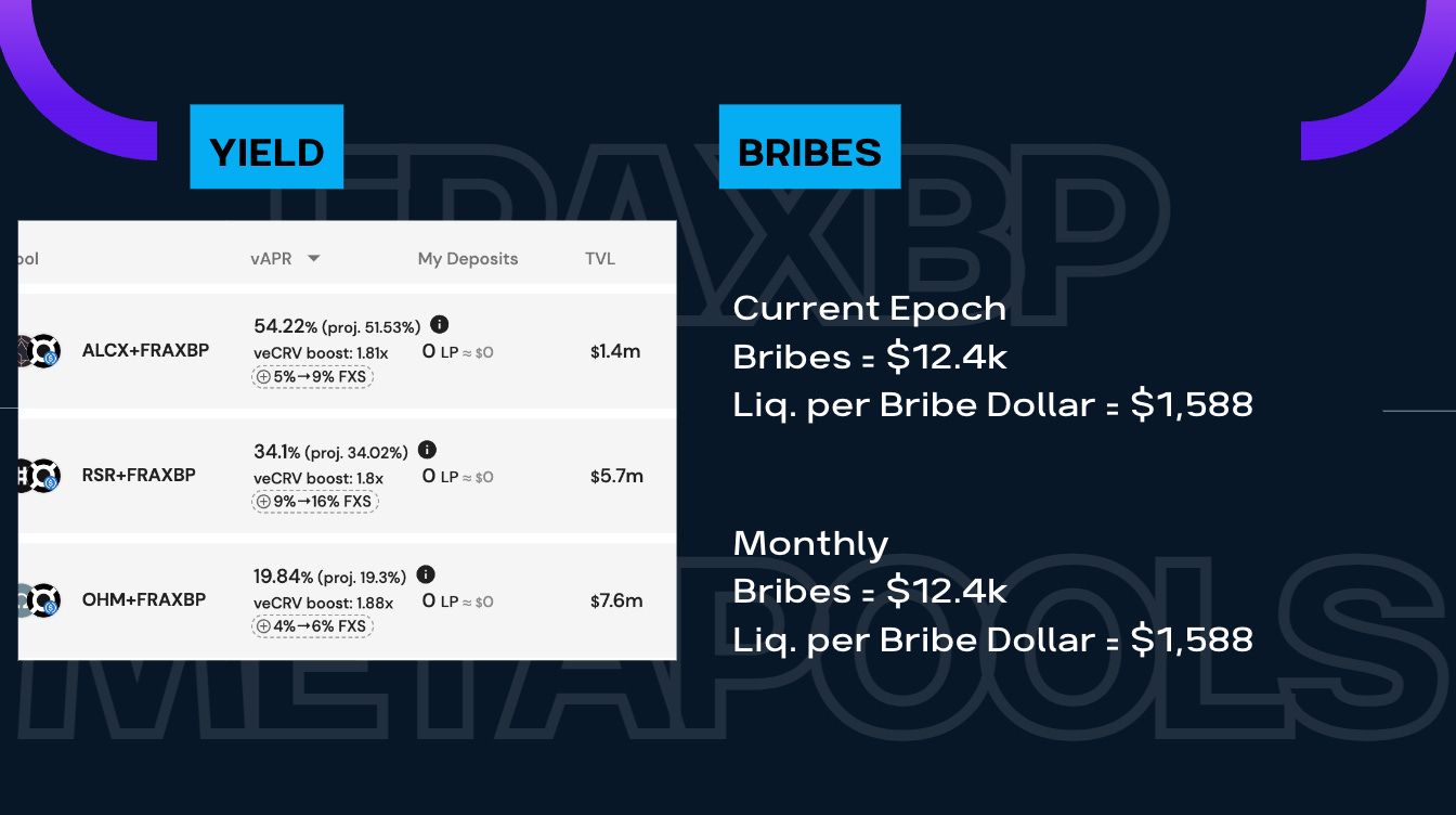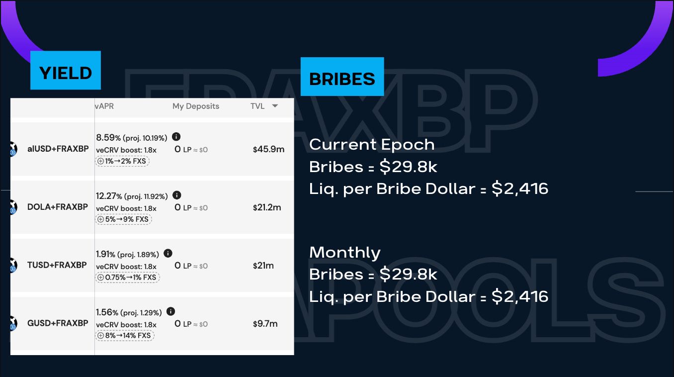 Reminder the metapool are pools that are PAIRED with the BasedPool, examples like LUSD/FraxBP.  We’re at $72M, a decrease of 9% from last week.  On the following slide, we’ll quickly cover some yields on these metapools as well as the bribes paid.  Because there are quite a few stablepair metapools, I’m only looking at the top ones by TVL.  The alUSD and FRAXBP pair is paying out 8.5% APR at nearly $46M in TVL. Honestly, still not too shabby if you believe/trust in alchemix’s mechanism and collateral set.  On the bribes front, Frax paid $29.8k this epoch.  And if we look at Liquidity per Bribe Dollar, Frax was able to pull in $2,416 per $1 of bribes spent.  For the whole month Frax spent $29.8k and got $2,416 of liquidity per $1 bribe dollar spent.  So, c’mon people, we got some yield and liquidity for your community, so come and get some!  Any projects out there looking to work with the Metapool, please join the Flywheel TG chat and DM any of the hosts for assistance.