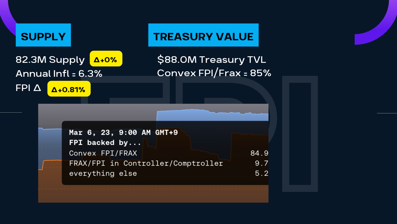 Next we have a new section I added.  Another one of Frax’s product that might not get as much as love as the other products is FPI.  Quick refresher, FPI is a Frax Price Index, which is a stablecoin that tracks inflation.  This is the first product of its kind on chain.  So lets run through the numbahs!  So far, we have 82.3M supply of FPI, current inflation reading is 6.3% and the FPI peg is ABOVE by 0.81% of its peg.  And you’re wondering how it maintains its peg to inflation, well that’s what the treasury is for.  For the record, FPI’s treasury is at $88M.  Like how the AMOs work for Frax stablecoin’s treasury, the FPI’s treasury is made up of FPI, FRAX, and a small percentage holding of FXS.  As you can see 85% of the treasury is in the FPI/FRAX convex, with another 10% just consisting of FPI & FRAX chilling in the Controller/Comptroller smart contracts.  All these assets are put to work just like in the AMO to earn that needed yield to keep FPI at the inflation peg.