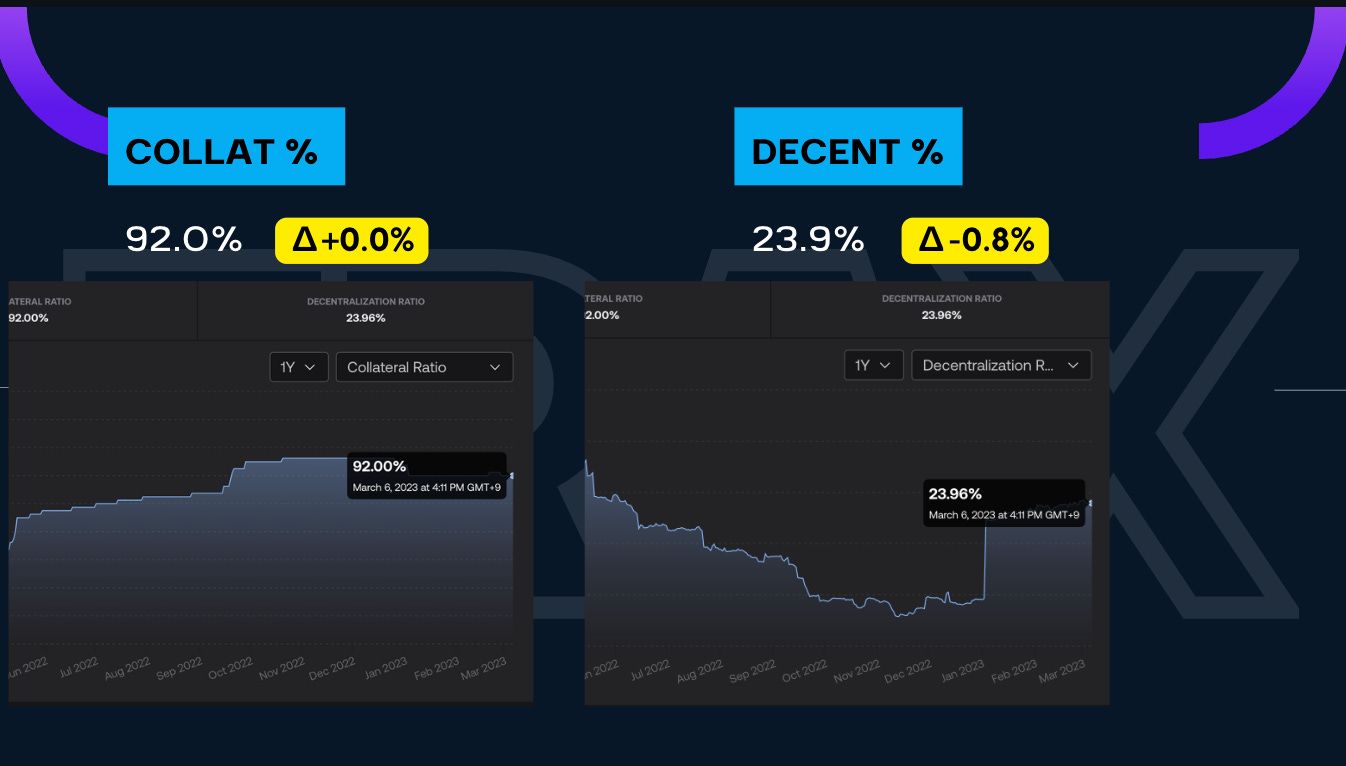 This is the % that conveys how much FXS (algorithmic) is used as collateral.  We’re unchanged at 92%.  Following we have the Decentralize %, which saw a decrease of 80 bps and are now sitting at 23.9%.