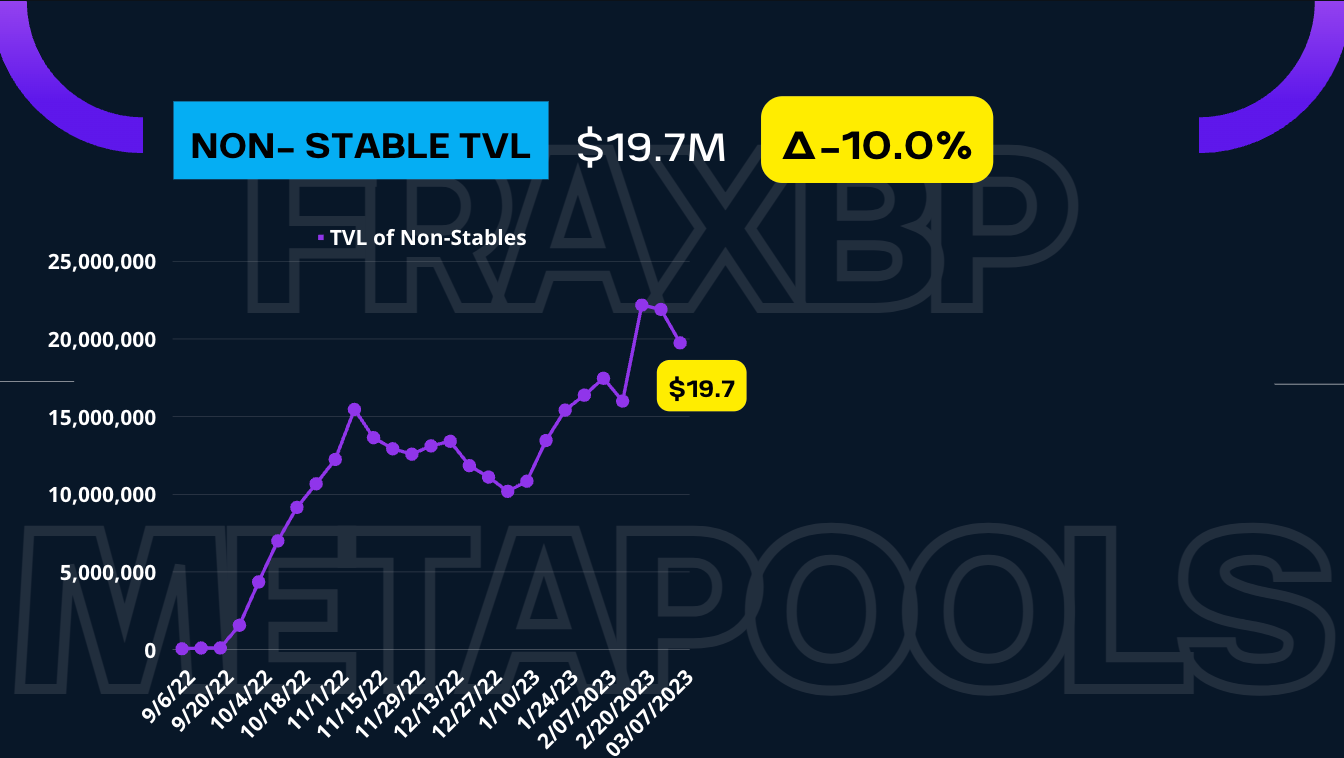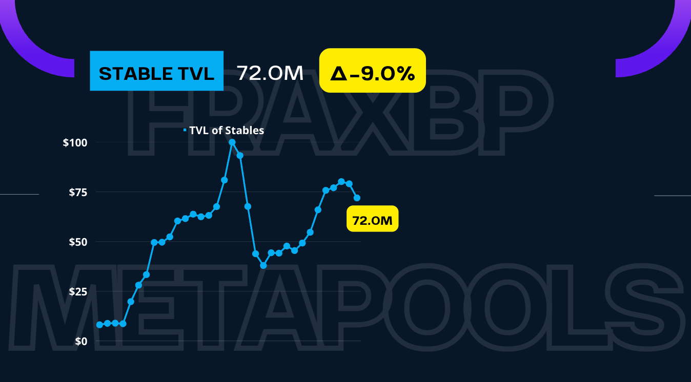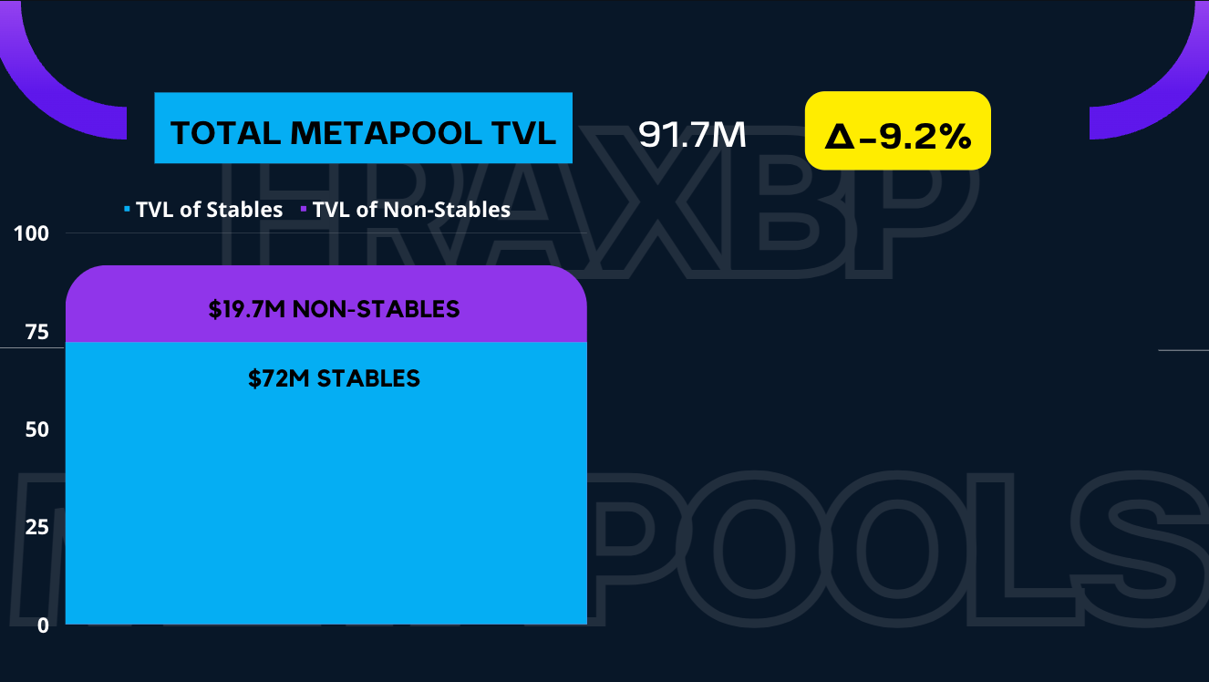 Now, we march forward to my favorite section of the Frax Check.  Ladies and gents, we are… drumroll…. STILL at 104% of the 3pool.  The FraxBasedPool is $521M versus 3pool's $501M.  Now, it wasn’t easy to get to the top but now we gotta stay at the top.  It seems that we’re maintaining a ratio here.  Also I looked back at when the FraxBP/3Pool % was the lowest and that was in early November last year, which also marked the bottom.  Do with that information with whatever you want.  Note that last week I mentioned Frax3CRV was down $100M I need to make a correction here, it wasn’t – my mistake.  It was supposed to be $456M but last week I said it was $347M.  This week we saw the Frax3CRV gaining a nice $10M in TVL while the other two pools TVL dropped.  Now lets move to over metapools.