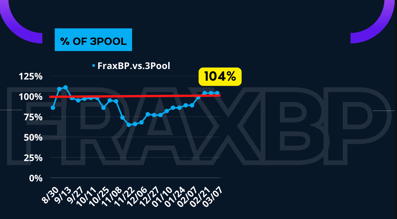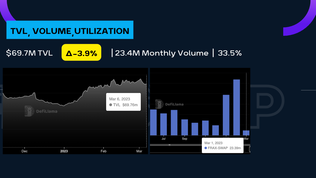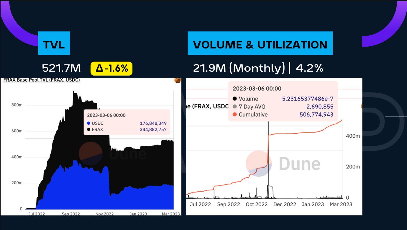 For this week we saw the FraxBP TVL dropped to $521M, which is -1.6% decrease from last week – tvl has declined two weeks in a row down approximately 3% in 2 weeks.  On the right side we have a new metric I wanted to start looking at which is the volume traded.  For context, in February we hit 49.3M, and in first week of March we hit 21.9M already.  Though, this is still only 4.2% utilization rate of the TVL.