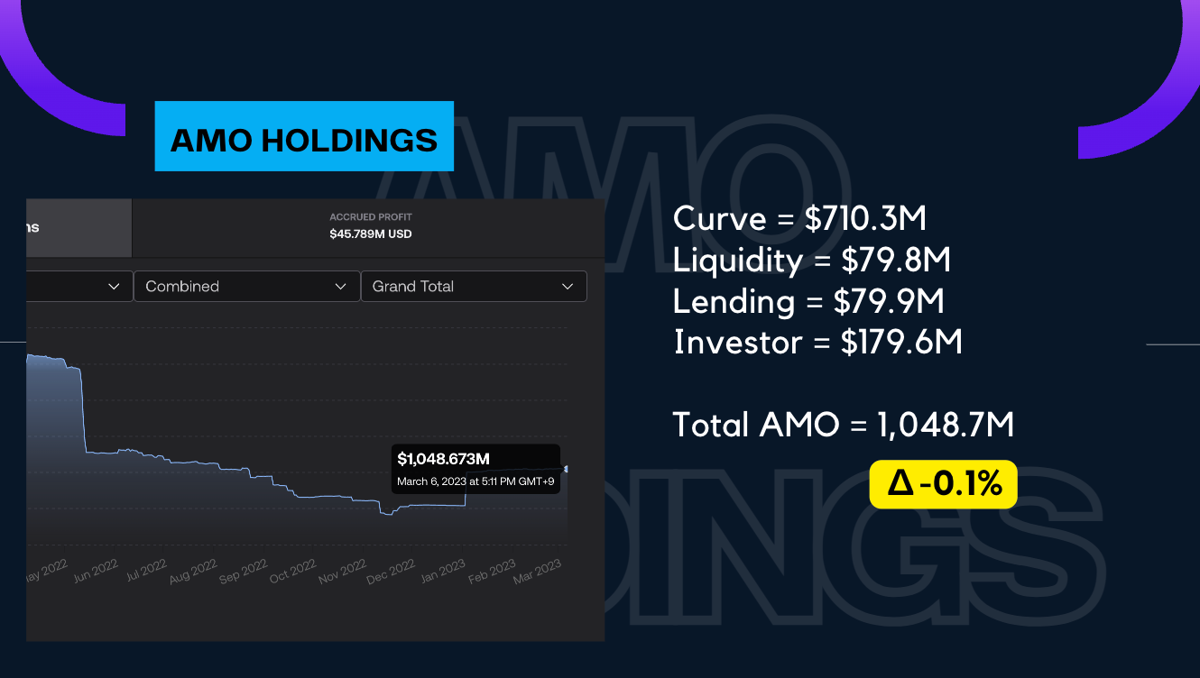 Finally, let’s jump into our profitability section starting an overview of the AMO holdings.  We have a grand total of $1048M across all the AMOs.  The Curve AMO is at 710M, Liquidity $80M, Lending $79.9M, and Investor 179M.