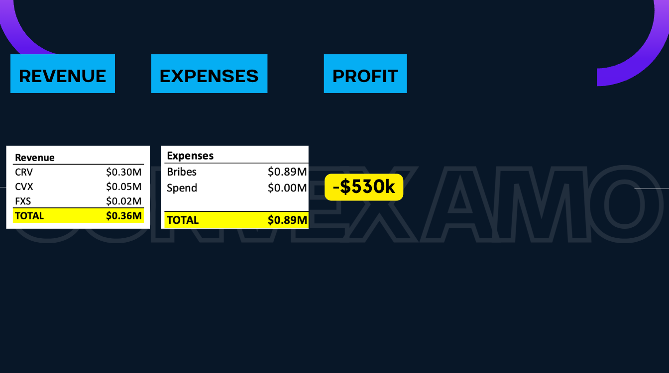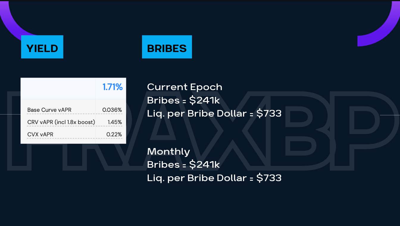 Following this slide, we have a yield and bribes section, where I look at the current yield being offered to LP into this pool and the bribes Frax Finance had to pay for the yield.  You see here that there’s an APR of 1.7% for a $530M pool so the estimated $345k of yield for the 14-day epoch because Votium epochs are 14 days.  Then we compare that to the bribes paid we see if there was any gain.  This epoch so far, we paid $241k so rough back of the envelope math says we’re doing pretty good so far this month.  However it’s important to note that Frax Finance’s POL isn’t the only liquidity in the pool so its reward shares are definitely diluted but that’s part of the plan as Frax wants to attract liquidity into the FraxBP.  To that end, $733 of liquidity were incentivized by $1 of bribes paid.