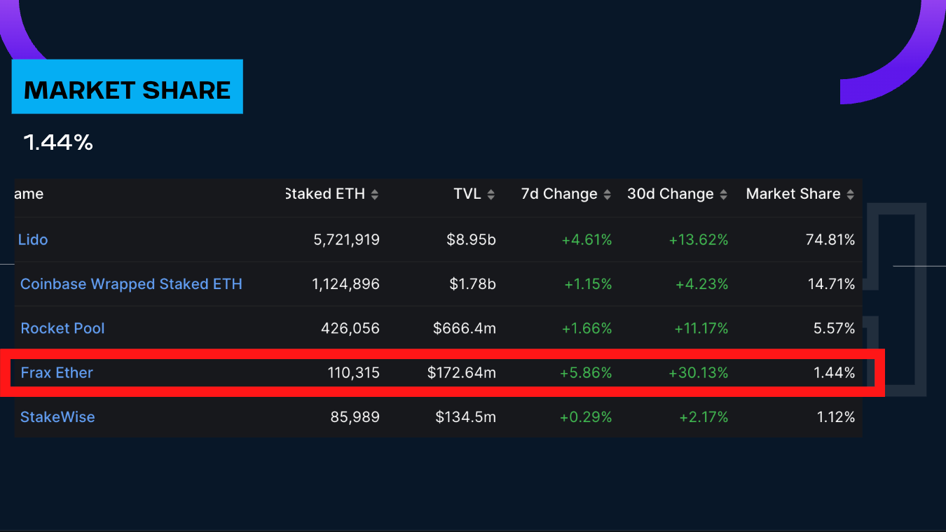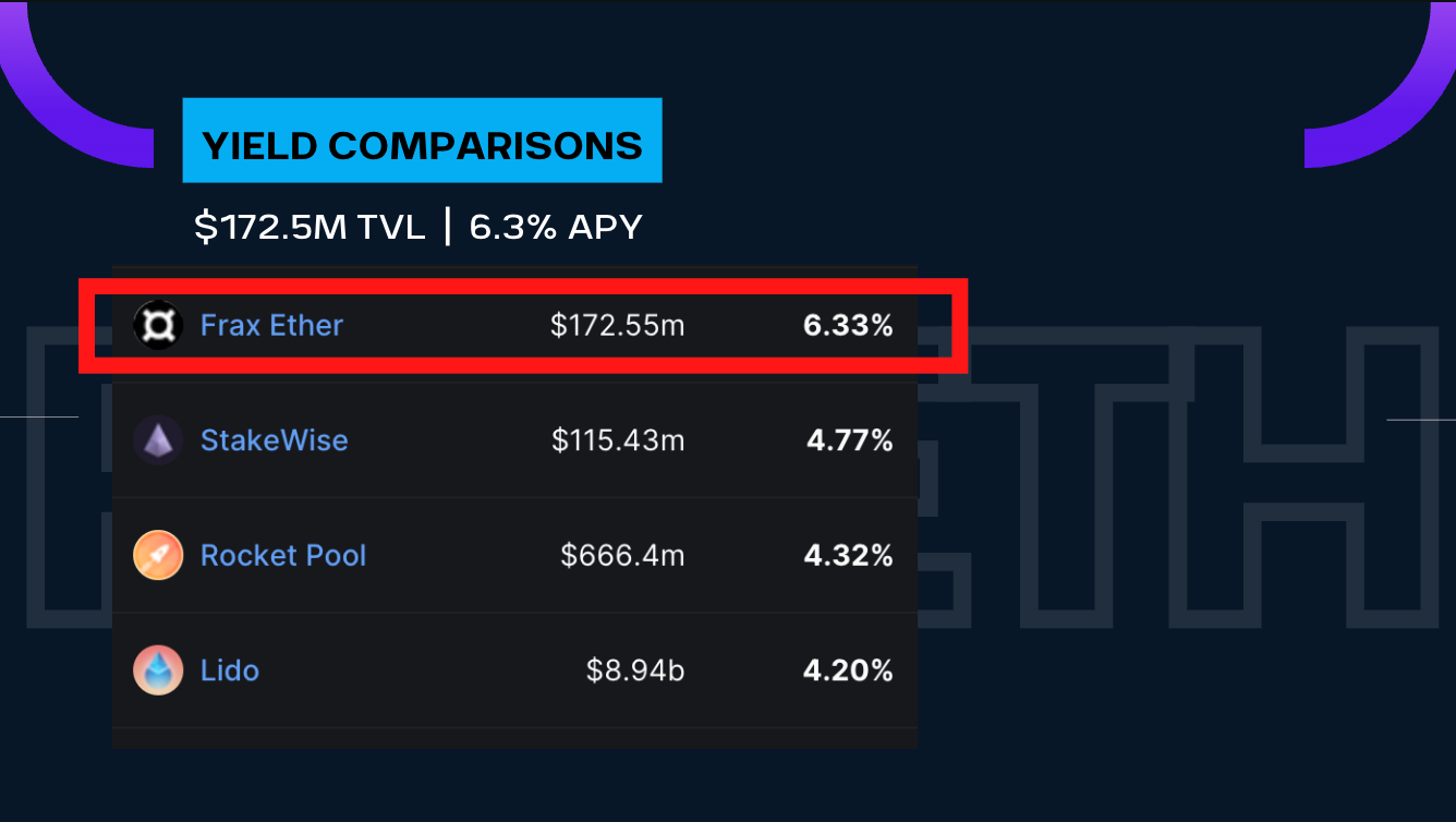 Here we layout the LSD market landscape.  Obvs, we have Lido in the lead with 74.8% of the market.  Frax REMAINED the highest 30-day delta in the group, at +30% so far.  FrxETH’s market share is at 1.44%.  Let’s keep fighting the good fight!  On the yield landscape, frxETH pretty much dominates with a 6.3% and the closest competitor is Stakewise at 4.7%.  We are the best game in town so come get some of this gud gud!