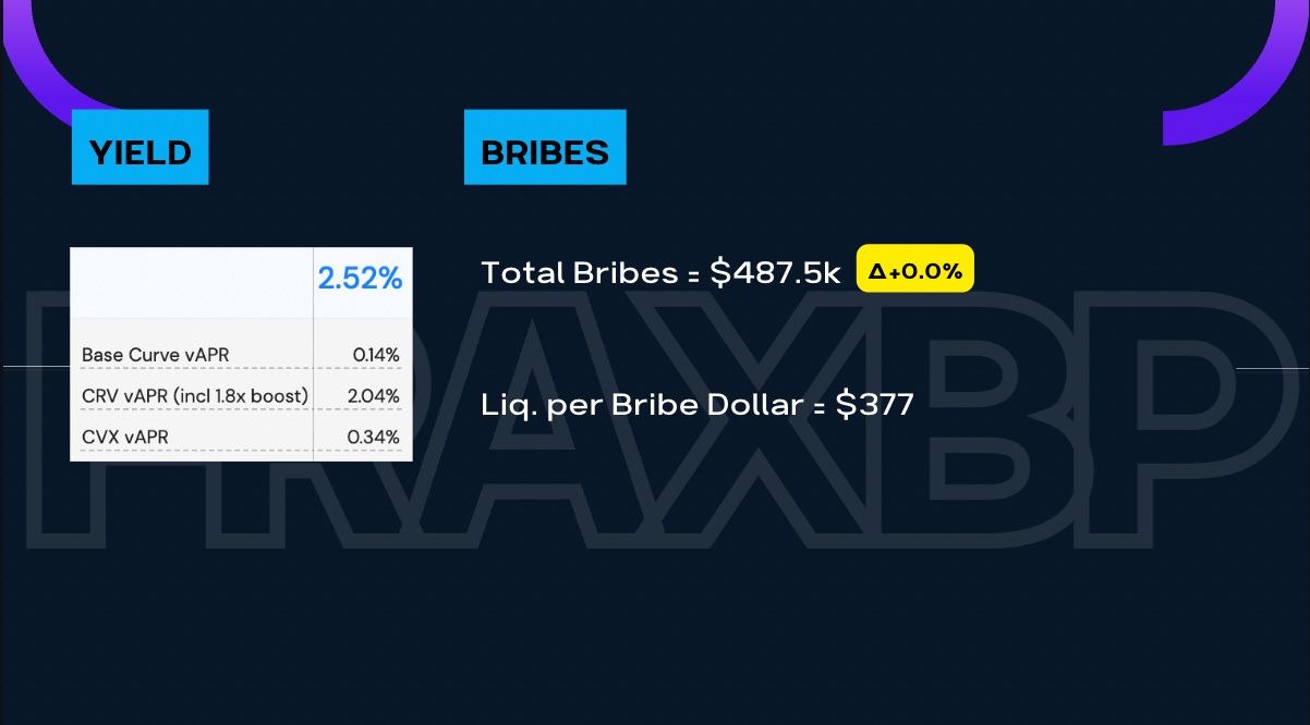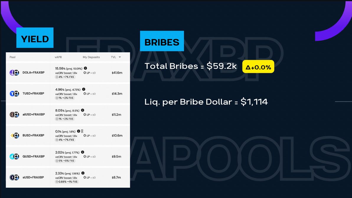 Reminder the metapool are pools that are PAIRED with the BasedPool, examples like LUSD/FraxBP.  We’re at $66.0M, an increase of 20.7% from last week.  We finally broke above the $50M level after 9 Frax Checks.  On the following slide, we’ll quickly cover some yields on these metapools as well as the bribes paid.  Because there are quite a few stablepair metapools, I’m only looking at the top ones by TVL.  We see that BUSD and GUSD is at 1.6% and 2.0% respectively – interesting that these CEX stablecoins aren’t requiring a higher premium.  This is below the FraxBP APR, who is LPing in these pools.  This could be an interesting on-chain analysis.  The alUSD and FRAXBP pair is paying out 8% APR at nearly $11M in TVL.  It was 9M last week and was paying 9%+ but a quick bump $2M in two weeks.  Honestly, still not too shabby if you believe/trust in alchemix’s mechanism and collateral set.  On the bribes front, Frax paid $59.2k for the month of January so far.  And if we look at Liquidity per Bribe Dollar, Frax was able to pull in $1,114 per $1 of bribes spent.  So, c’mon people, we got some yield and liquidity for your community, so come and get some!  Any projects out there looking to work with the Metapool, please join the Flywheel TG chat and DM any of the hosts for assistance.