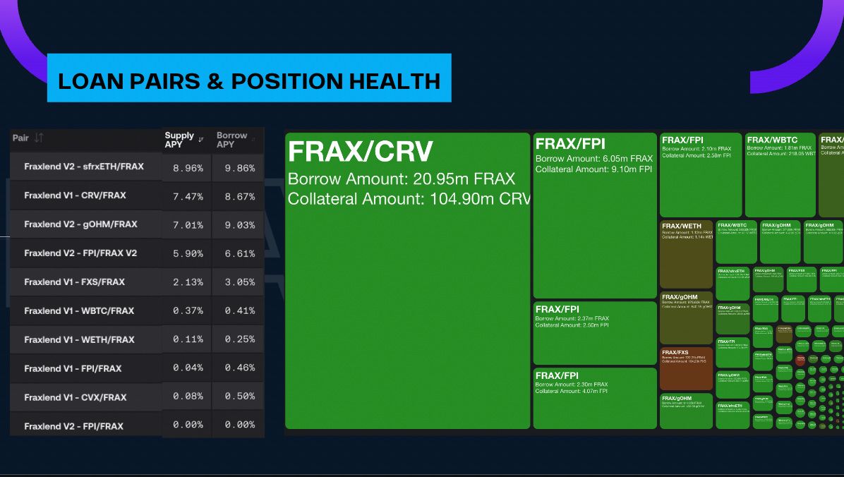 Next we have our FraxLend section.  We’ve snatched a TVL of $233M with $50.5M in borrowed FRAX.  The charts I like to look at are the Collateral Value and the Supply Value.  These are great proxies for trust in the product.  A good confidence check and you see the graphs are trending up and to the right.  Following that I like to check the utilization %, which for me is how much of the total supply has been borrowed, and we’re at a 81.5% utilization rate across all the lending pairs.  This is a slightly different way of looking at utilization rates, but I prefer it.  Currently, there are 12 pairs being offered on FraxLend but more and more are being added.  Also take a look at the current Supply APY for sfrxETH/FRAX pair.  A whopping 8.96% on pristine sfrxETH collateral.  I would probably park FRAX here.  Be sure to listen to our Governance Roundup to get any alpha on any future pairs.  There’s another cool visualization of the loan health that I want to highlight.  The largest position on FraxLend is nearly 21M FRAX being borrowed against 104M of CRV, as you can see the position is quite healthy, and from a quick glance, most positions on fraxlend are quite healthy.