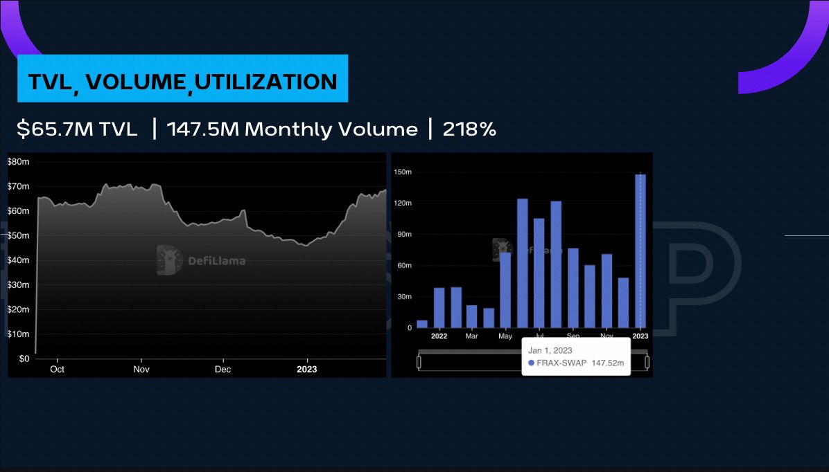 The last leg of the DeFi Trinity: the DEX aka FraxSwap.  Per DeFi Llama, the TVL is $65.7M with a 147.5M monthly volume so far for January.  I just took the Monthly volume divided by the TVL to get a utilization rate of 218%.  Granted the volume this past week or two or three has been picking up so if you look at December, which looks to be about a third so utilization rate could be in the 70%s, but that’s still pretty good.  Now there is a slight discrepancy between DeFi Llama’s reported TVL and the one on Frax Facts but that’s because of the massive $85M FraxFPI pool that DeFi Llama isn’t including in the TVL.