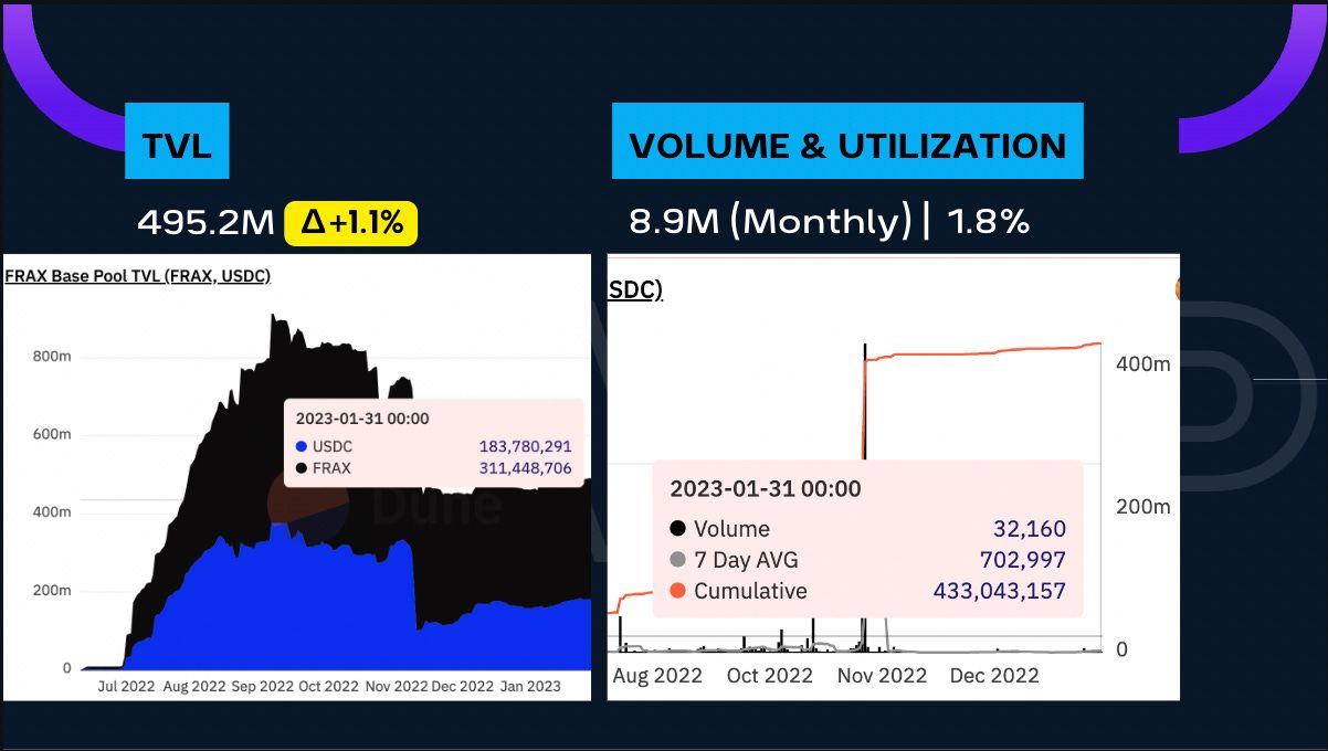 The FraxBP has been holding steady at just about $500M for the past few months.  For this week we saw the TVL got to $495.2M, which is 1% more than last week so pretty much unchanged.  On the right side we have a new metric I wanted to start looking at which is the volume traded.  Since this Frax Check lands perfectly at the end of the month, we have the monthly volume for January at $8.9M which represents about only 1.8% utilization of the nearly $500M TVL.  Not great tbh.  Not great.  But I’m here to report the on-chain data.  But also said differently, there’s more than sufficient liquidity to facilitate magnitudes more volume than where we are at now.