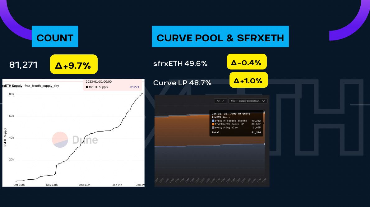 Next, we have our FrxETH segment.  We start by checking the frxETH supply.  As always, it’s up only!  The count is at 81,271.  And look at that chart, I know you can’t read it but just appreciate the verticalness off that graph.  +9.7%.  Hot.  Let’s look at where the frxETHs are hanging out! As a reminder, You can stake your frxETH into the sfrxETH vault to earn the native ETH staking yield.  And in that vault we see that 49.6%, (pretty much unchanged from last week) of the frxETH is chilling and stacking ETH earning a nice 7.18% APR.  The other place you can take your frxETH is to the curve pool of frxETH/ETH, where you can join 48.7% (up 1% from last week) of the frxETH supply earning 8.2% APR in CVX, CRV, FXS.  The remainder 1.7% is floating in the ether somewhere.  But enough talk of the supply and the yield, let’s get down to the peg.