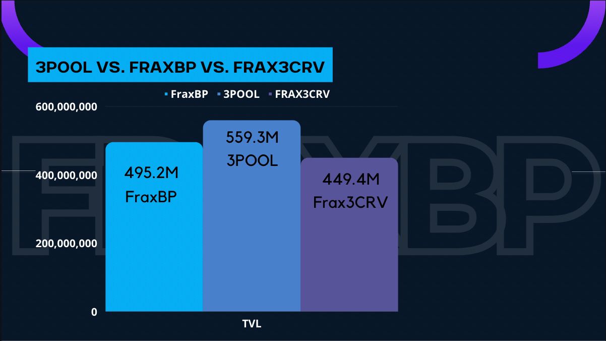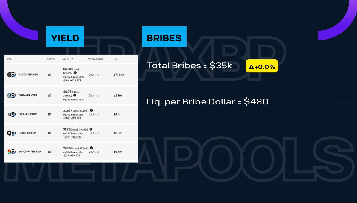 Following this slide, we have a yield and bribes section, where I look at the current yield being offered to LP into this pool and the bribes Frax Finance had to pay for the yield.  You see here that there’s an APR of 2.52% for a $500M pool so the estimated $483k of yield.  The quick math is take TVL of $500M, multiply by 2.57%, divide by 365, multiply by 14 days (because Votium epochs are 14 days).  Then we compare that to the bribes paid we see if there was any net gain on the bribes.  This month so far, we paid $487.5k so rough back of the envelope math says we’re pretty much breakeven for the week.  However it’s important to note that Frax Finance’s POL isn’t the only liquidity in the pool so its reward shares are definitely diluted but that’s part of the plan as Frax wants to attract liquidity into the FraxBP.  To that end, $377 of liquidity were incentivized by $1 of bribes paid.  Now, we march forward to my favorite section of the Frax Check.  Ladies and gents, we are… drumroll…. at 89% of the 3pool.  The FraxBasedPool is $495.2M versus 3pool's $559.3M.  What’s noteworthy is that the FraxBP didn’t gain the TVL but rather 3pool losing its TVL.  Note that we are STILL above the Frax3CRV pool!!!  Let’s keep the momentum going.  Steppingstones, 3Pool next.  Moving on, let’s chat about our metapools.