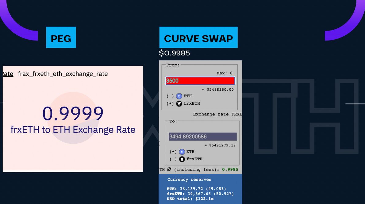 Peg check here is AS strong AS it could be, you see the price delta at 0.0001 between frxETH and ETH.  But, we obvs have to go into the market and check this ourselves and you see here that I tried to swap a 3500 frxETH which is roughly the amount of the largest frxETH holder and I get an exchange rate of 0.9985.  That’s not too shabby, down nearly 4 bps from last week.  And also let’s just note the TVL here, we broke $100M last week, and now we’re at $122M.  9 SOLID FIGURES baby.  So far so good, let’s see how we stack up with the others.