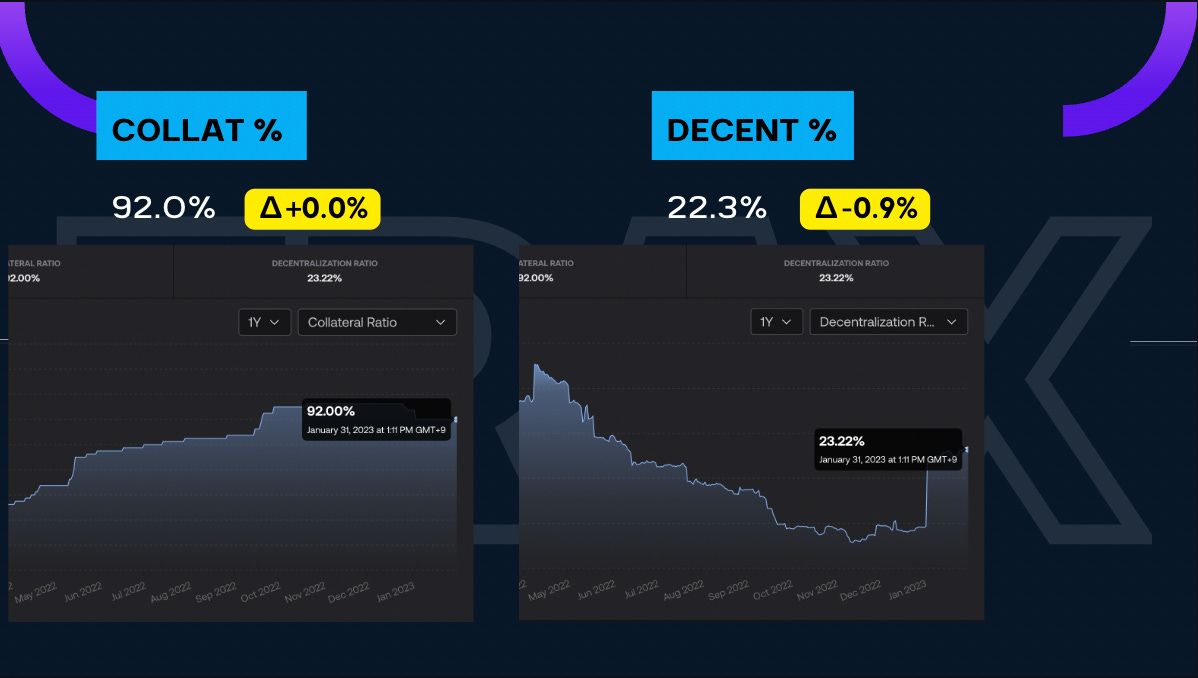 This is the % that conveys how much FXS (algorithmic) is used as collateral.  We remained unchanged for the week still at 92%, it’s been this way for a 5 Frax Check now.  Following we have the Decentralize %.  A month ago, we saw a big reversal jumping but this week, we’re down small from last week by nearly 1%.  Still V v v v much bear market vibes across the board when it comes to these two metrics.  We want to see the Collat % going back to the low 80s and the Decent % going back to 30s.  But I’m hopeful.